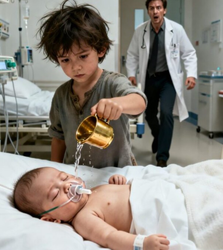 Inmitten dieser schwermütigen Stille tauchte plötzlich ein obdachloser Junge in abgetragenen Kleidern an der Tür der Intensivstation auf, ohne dass jemand begriff, wie er hineingelangt war. Unter den erstaunten Blicken des Sicherheitsdienstes und der Ärzte trat er langsam an das Bettchen des Säuglings heran. Er zog einen antiken Metallkelch aus seiner Tasche und goss vorsichtig eine klare Flüssigkeit daraus auf die Brust des Kindes. In diesem Moment spürten alle im Raum, dass sie an der Schwelle zu einem Wunder standen, das sich jeder Logik entzog.