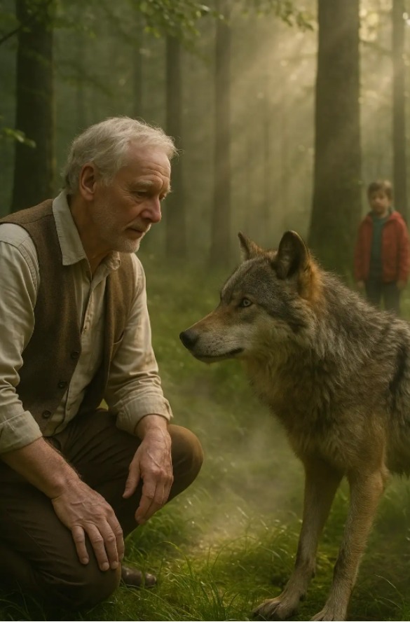 Einige Monate vergingen. Eines Sommers ging Michails Enkel, der achtjährige Sascha, in den Wald, um Beeren zu sammeln, und kam nicht zurück. Der Alte stürzte los, um ihn zu suchen, rief, rannte, außer Atem. Seine Stimme war heiser, sein Herz hämmerte, als würde es herausspringen wollen. Und plötzlich – ein Rascheln hinter ihm. Michail drehte sich um und erstarrte. Aus dem Dickicht trat ein Wolf. Genau derselbe. Er hinkte auf der bekannten Pfote. Sery stand da und sah ihn an – ruhig, zuversichtlich. Dann drehte er sich um und ging voran, ohne sich umzublicken. Michail verstand: Er rief ihn. Nach ein paar Minuten hörte er – Kinderweinen. Sascha saß unter einer Tanne, voller Tränen und Kratzer, aber lebend. Als der Alte herbeieilte, war der Wolf bereits verschwunden. Nur die Pfotenabdrücke auf dem feuchten Boden erinnerten daran, dass er hier gewesen war.