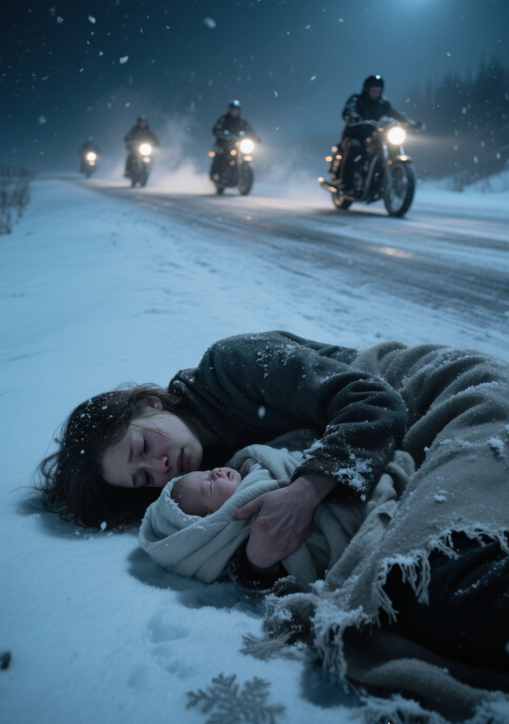 Schnee fiel lautlos um sie herum. Kein Biker sprach ein Wort. Cole hielt die Neugeborene dicht an seiner Brust, hüllte sie in seine Lederjacke, während die anderen schweigend den Kopf senkten.