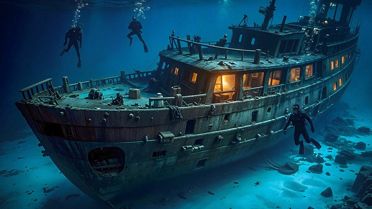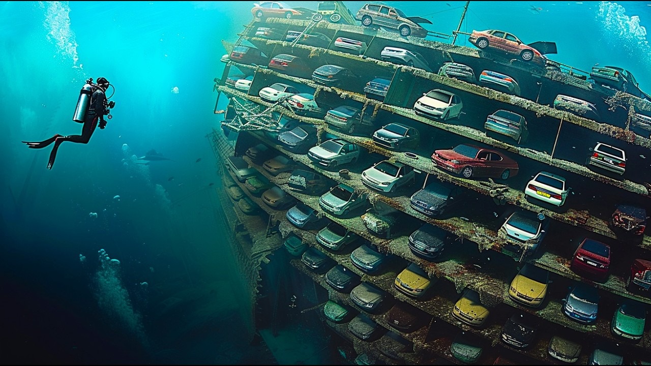 Dann, wie aus der blauen Tiefe auftauchend, zeichnete sich eine massive Gestalt ab. Zunächst dachten wir, es sei ein gewöhnliches Wrack… doch je näher wir kamen, desto mehr erstarrten wir vor Staunen. Vor uns ragte ein riesiges Schiff empor, ein wahrer Unterwasser-Koloss, Stockwerk für Stockwerk mit Autos gefüllt. Sie standen so perfekt geordnet, dass es aussah, als hätte jemand sie erst gestern hineingestellt. Doch Salz, Algen und Moos hatten sie längst überzogen. Ein Schauer lief mir über den Rücken, als ob das Wasser direkt unter meine Haut kriechen würde. Mein Freund legte mir die Hand auf die Schulter und fragte nur mit Blicken: „Siehst du das auch?“
