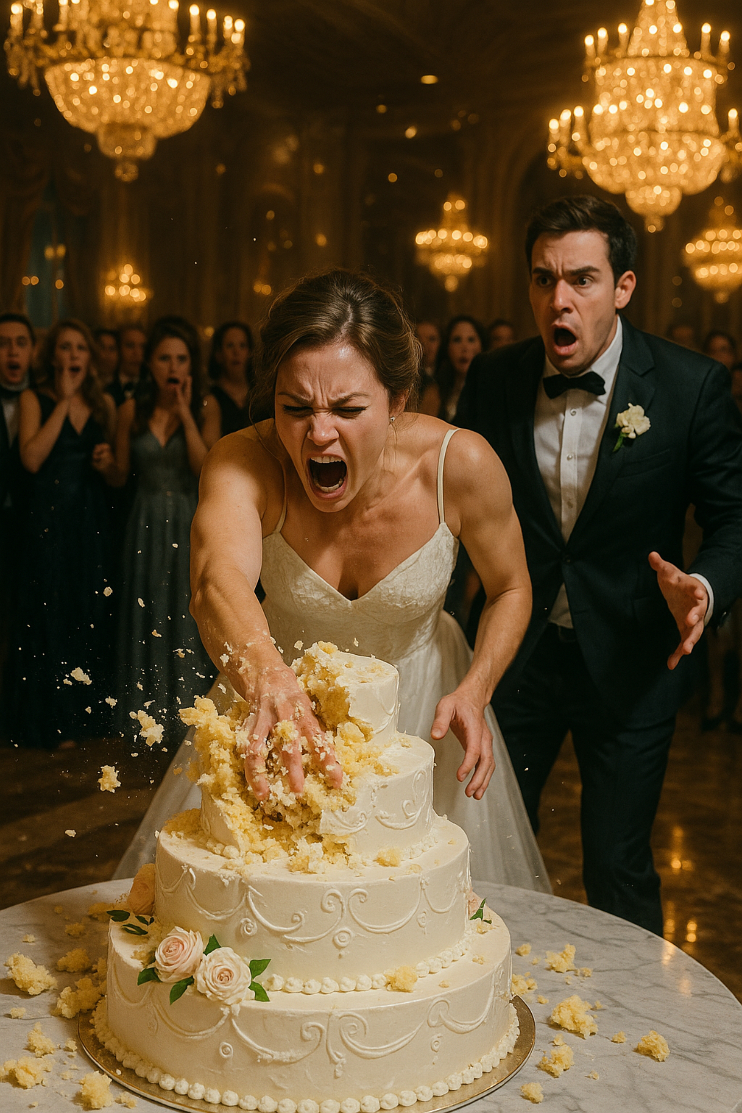 Der Klang war ohrenbetäubend. Die siebenstöckige Torte wankte und stürzte auf den Marmorboden. Porzellan zersprang. Schwere Schichten von Biskuit und Creme explodierten, spritzten die ersten Gäste. Goldene Blätter und weiße Glasur bedeckten mein makelloses Kleid und Ethans teuren Smoking.